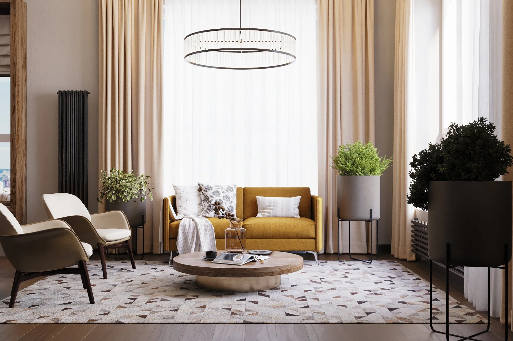 Das Design ist modern, mit hochwertigen Materialien, Möbeln auf hohen Beinen und einer reduzierten, aber eleganten Formensprache.