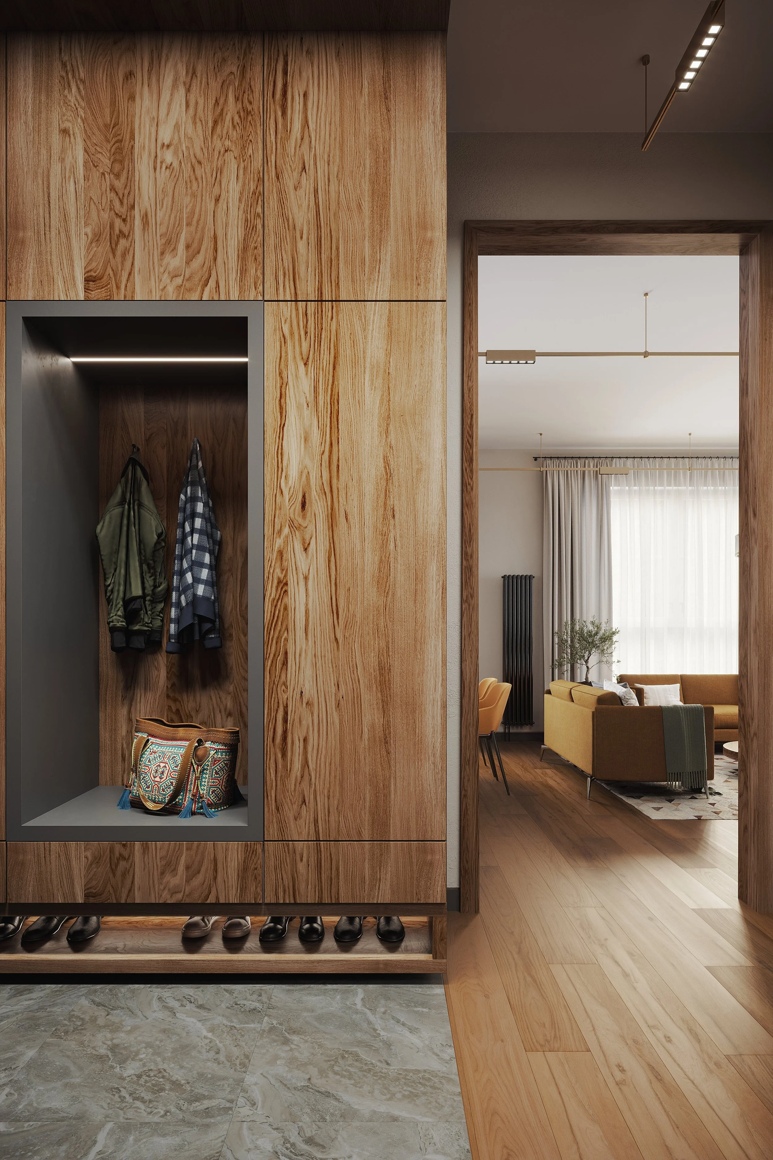 Der markante Eingangsbereich mit einem eingebauten Schrank sorgt für eine klare Struktur und bietet viel Stauraum. Hochwertige Materialien und ein minimalistisches Design unterstreichen die Eleganz dieses Raumes.